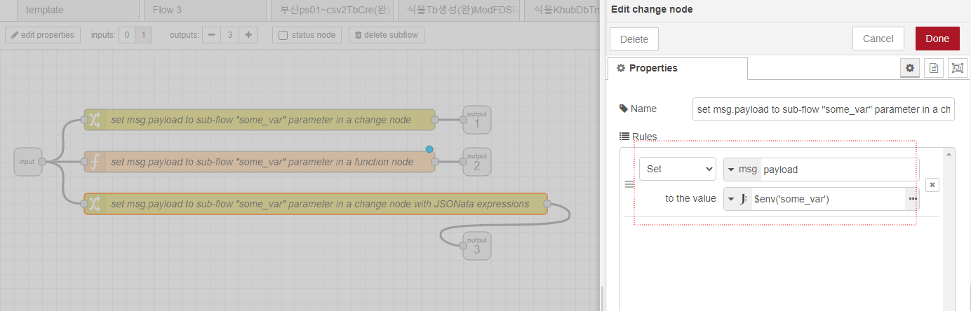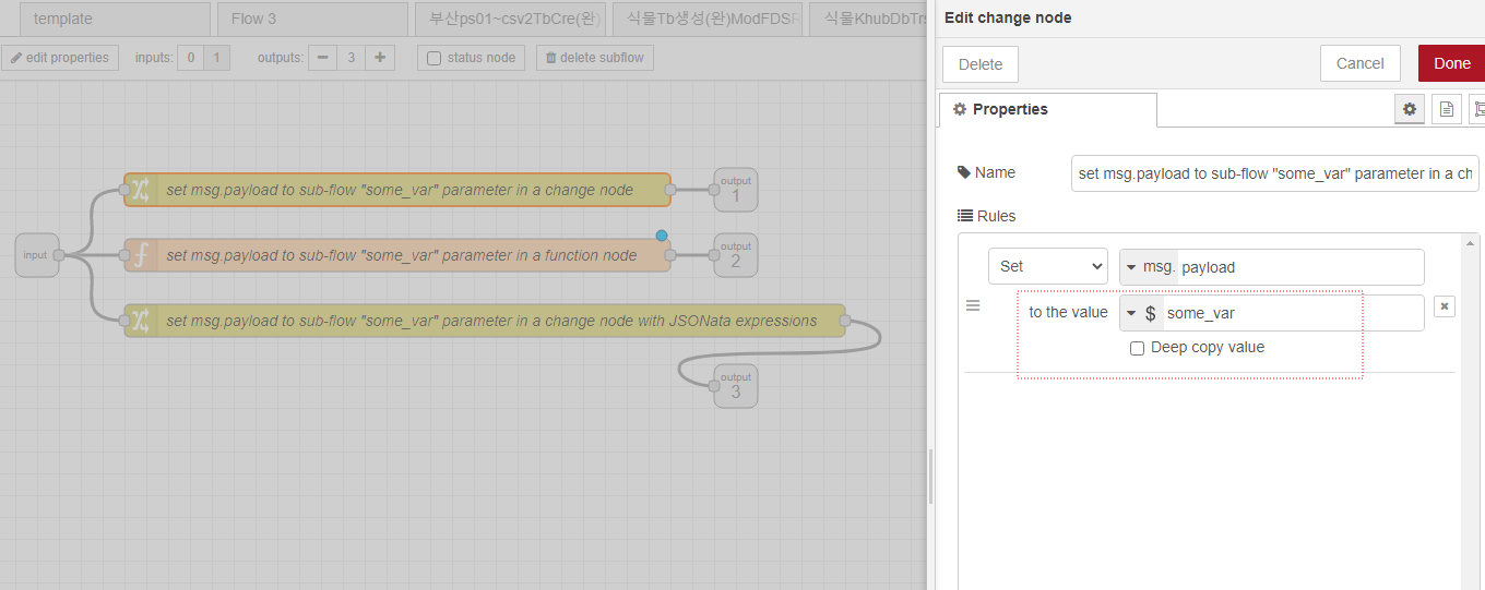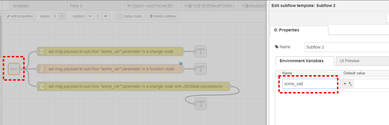 subflow 2라는 것은 some_var를 받아 some_var 는 문자 "happy" 라는 데이타이고 3개의 출력이 나간다..